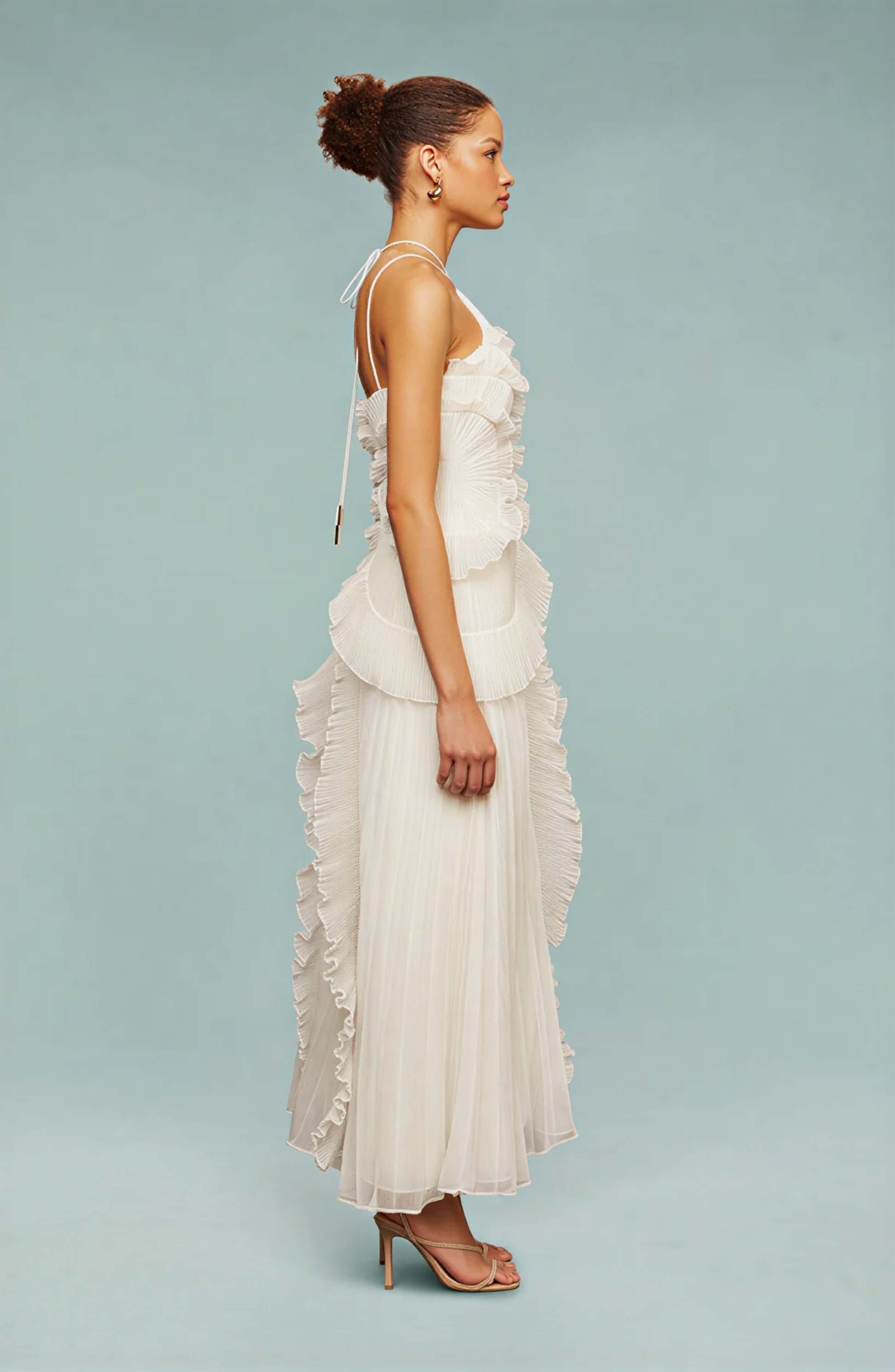 The Aveloria Pleated Frill Halter Neck Maxi Dress embodies soft femininity with its elegant halter neckline and flowing, pleated silhouette. Cascading frill trims add gentle movement and texture, bringing a romantic touch that feels timeless yet fresh. Crafted from lightweight, breathable fabric, this dress is perfect for weddings, garden celebrations, and warm summer soirées where effortless elegance takes centre stage.